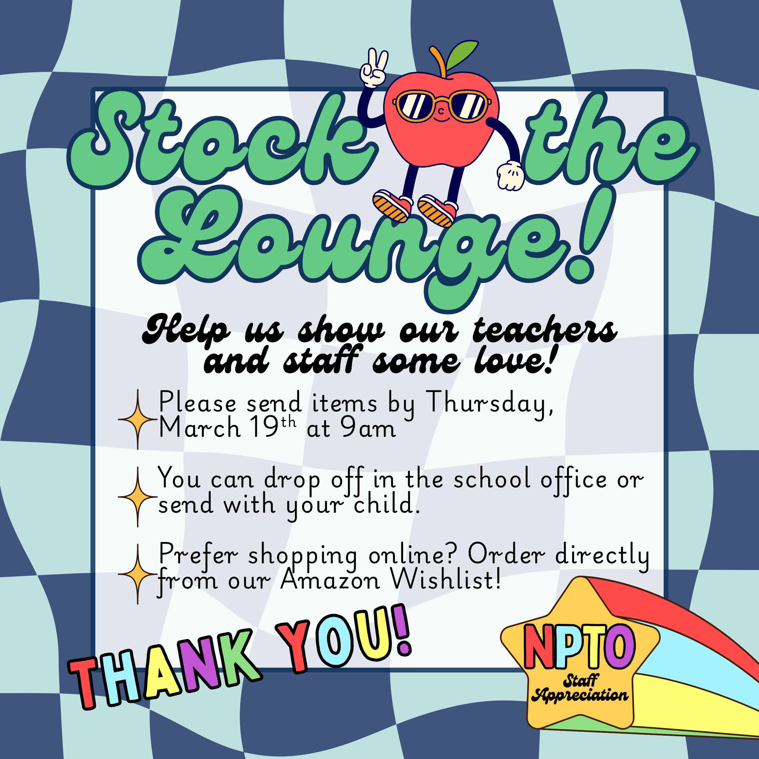 North families, help us refresh the staff lounge and treat our incredible teachers and staff. There are two easy ways to participate: sign up to shop and drop off items at school by 9:00 AM on Thursday, March 19, or purchase directly from our Amazon Wishlist. If ordering through Amazon, there is no need to sign up. Thank you for helping us show appreciation to the people who care for our students every day!