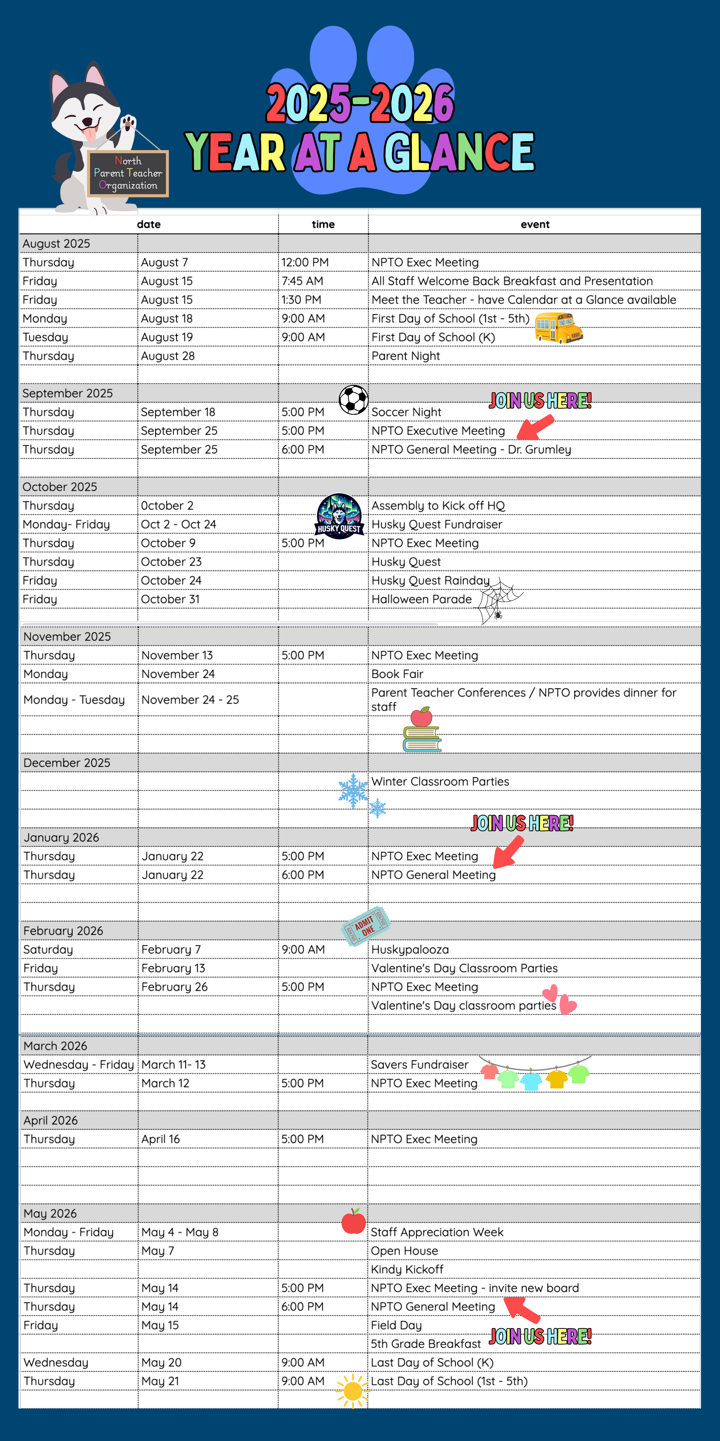 Check back here often and follow the NPTO for updates: D47NPTO.org, Facebook @D47NPTO, Instagram @D47NPTO, Remind (#NORPTO to 81010), and in the Husky Happenings newsletter.